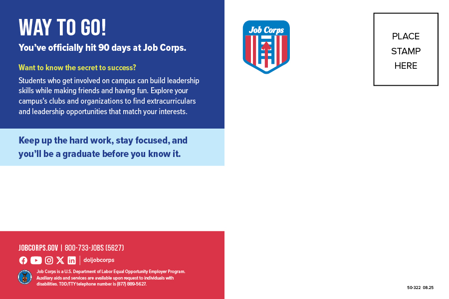 Admissions counselors should send this card after a student has spent approximately 90 days at Job Corps, reminding students that you are still available to answer questions and help them navigate through Job Corps. Please note that this postcard is part of a three-part series of postcards encouraging students to check in with their admissions counselors during the first 90 days at Job Corps to answer any questions or to share their progress on center.