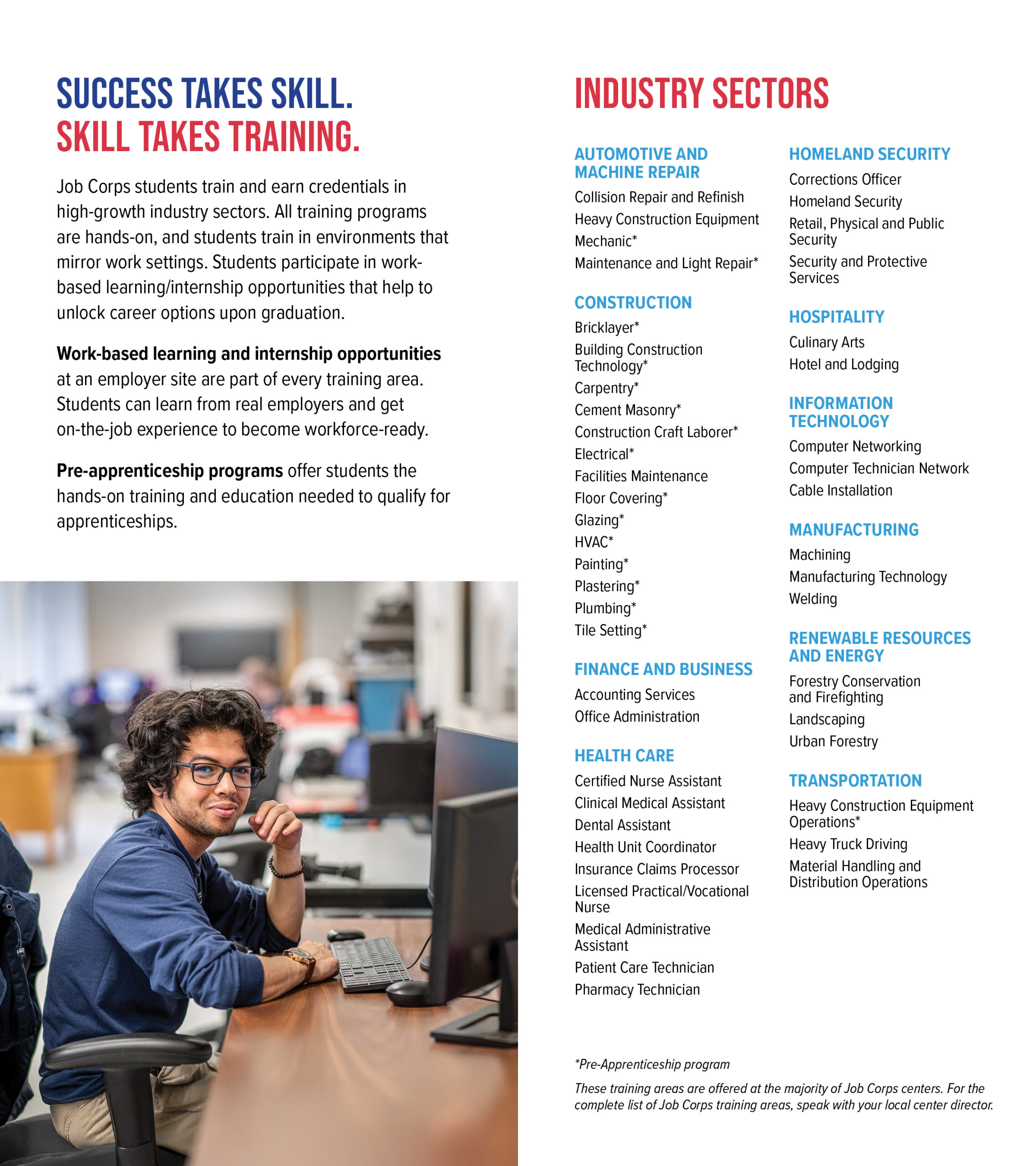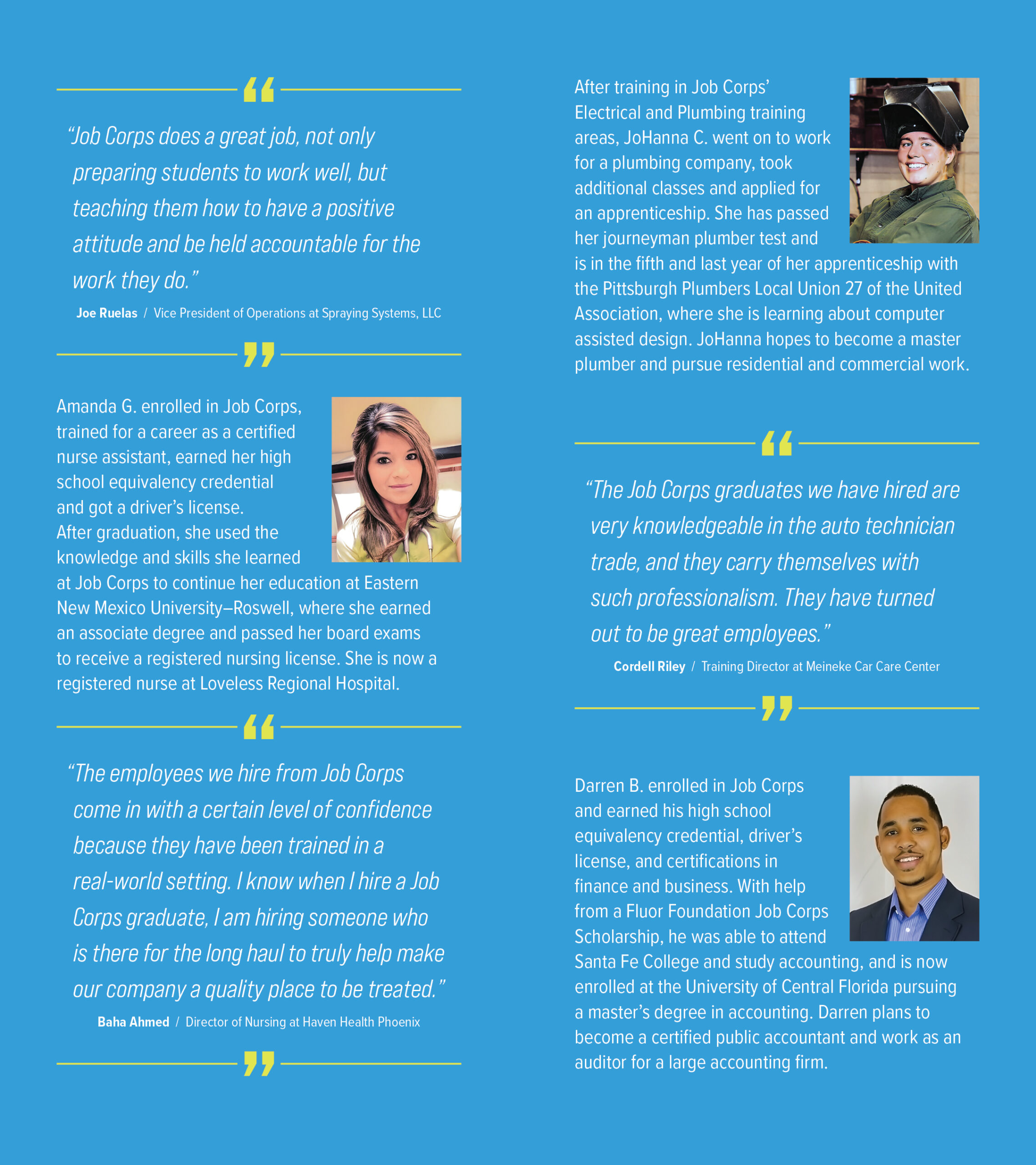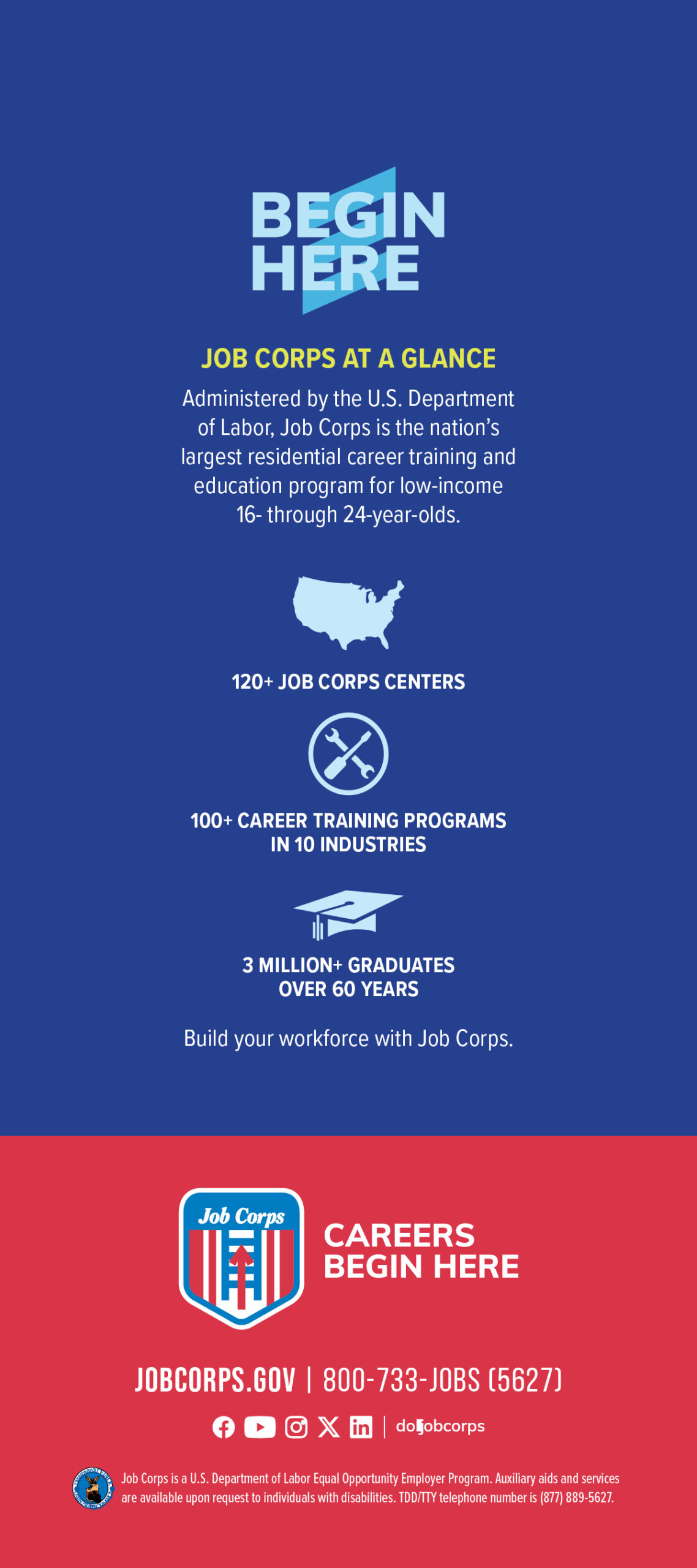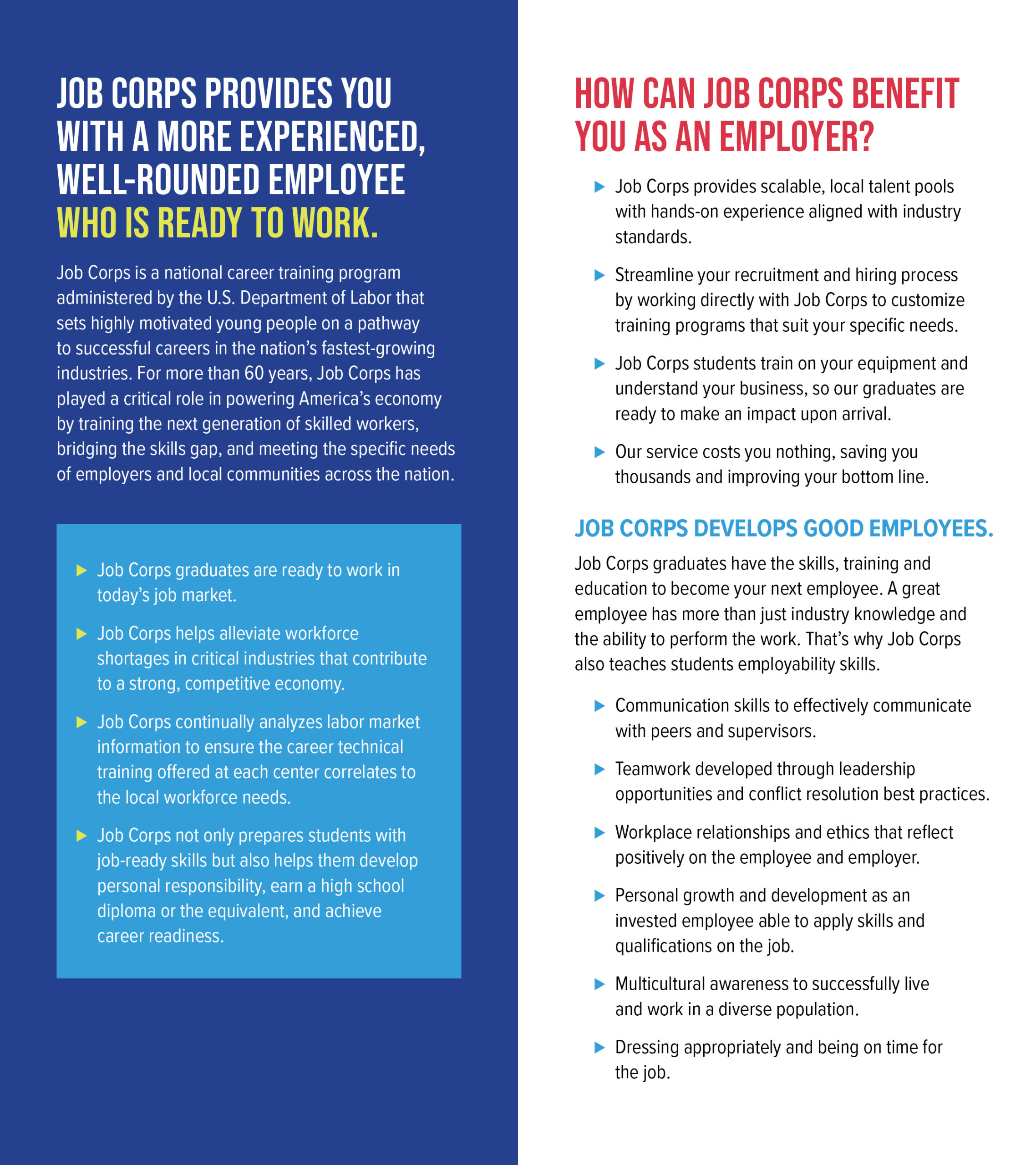 The Job Corps Employer Brochure is for employers who may be considering hiring a Job Corps student and should be shared with local employers, community leaders, and government officials. The brochure details how employers can benefit from hiring Job Corps students who are dependable, work-ready, cost-efficient employees, and includes testimonials from company leaders who have hired Job Corps students. Inside this brochure, employers will read how Job Corps can provide scalable and local talent, a streamlined recruiting process, and experienced recruits. The brochure also offers an overview of the program, including training areas and center locations.