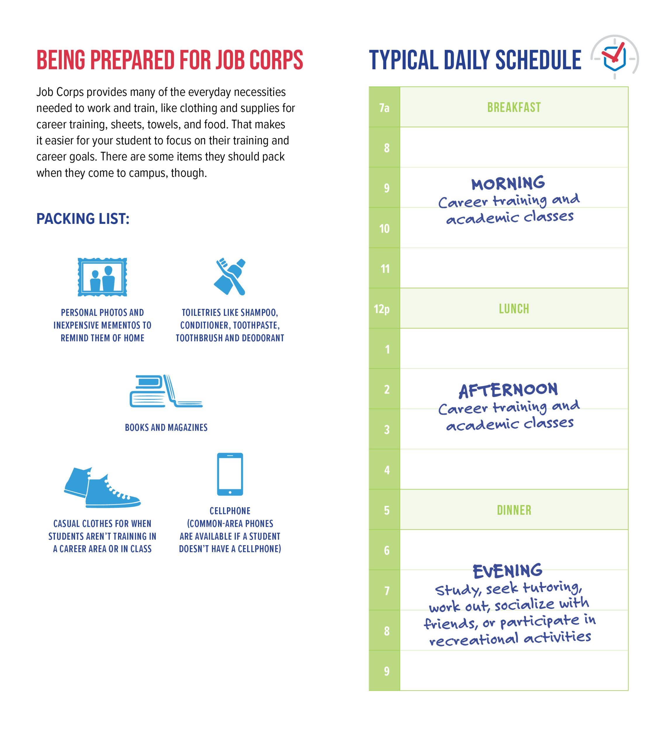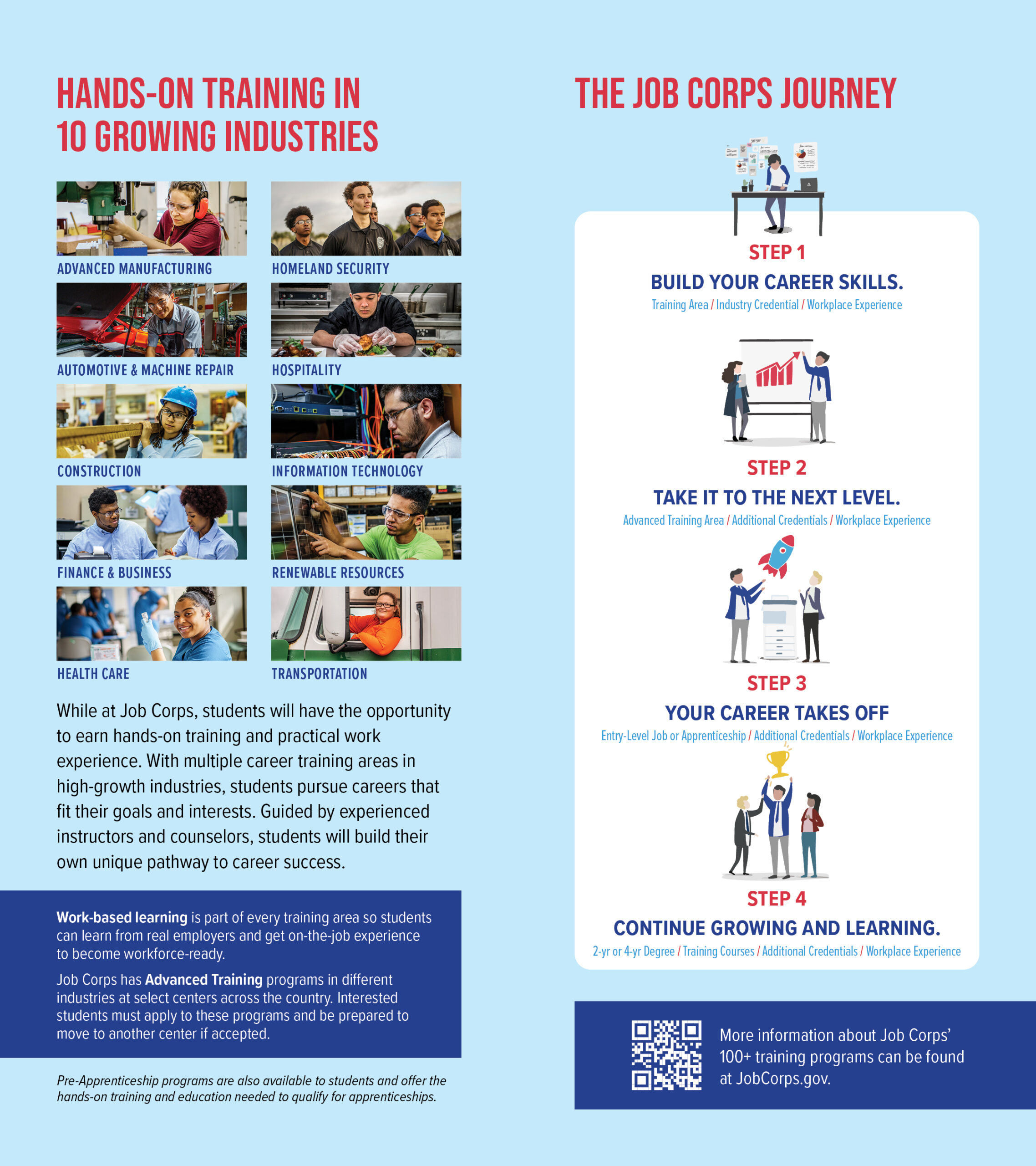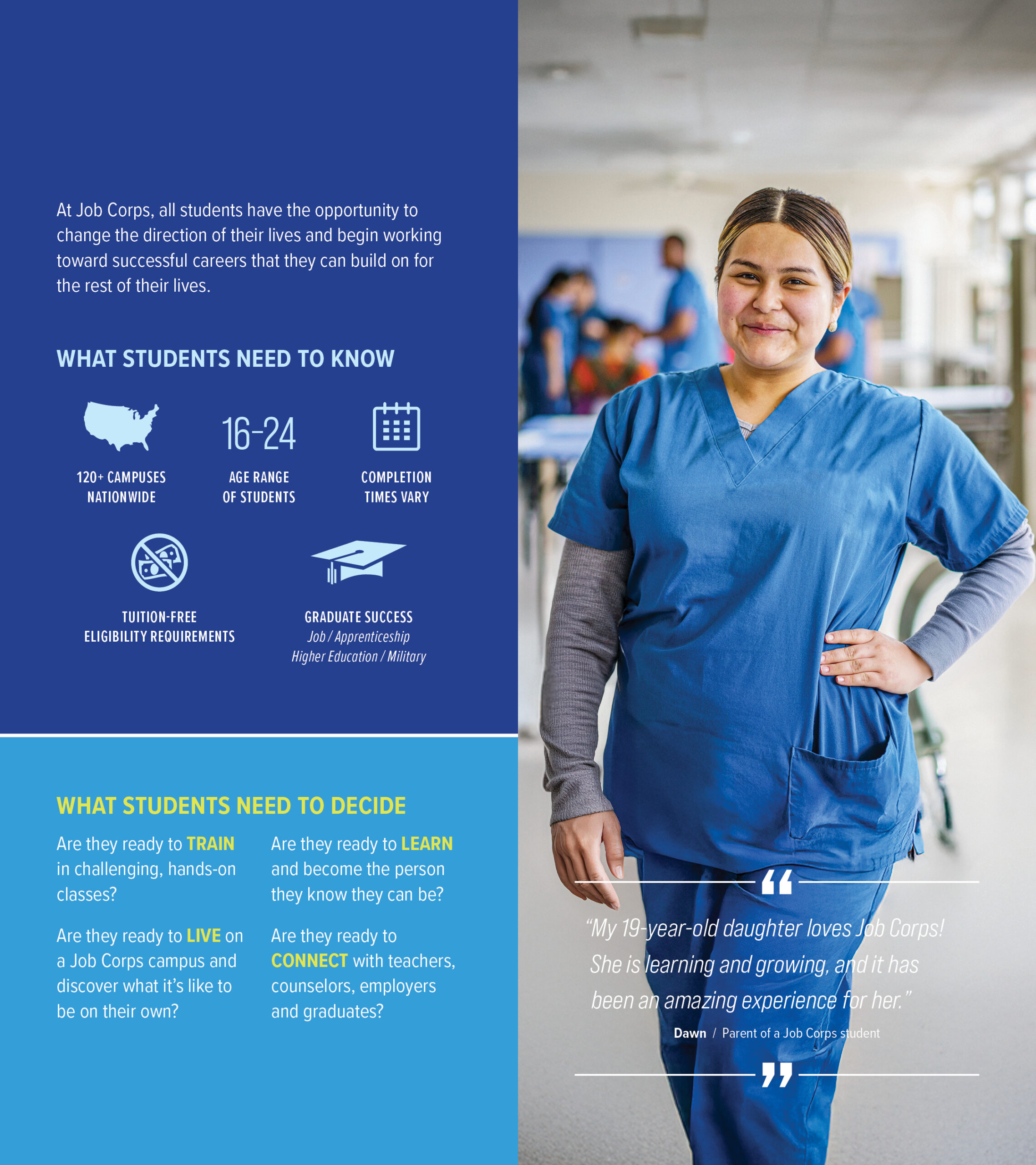 This bilingual guide answers questions that parents, guardians, or other key influencers might have about Job Corps’ training, education, and life on center. With one side in English, and the other in Spanish, this guide encourages parents and guardians to be involved in the important decision to enroll in the program and explains how Job Corps can help students gain the career skills and education needed for a promising future.