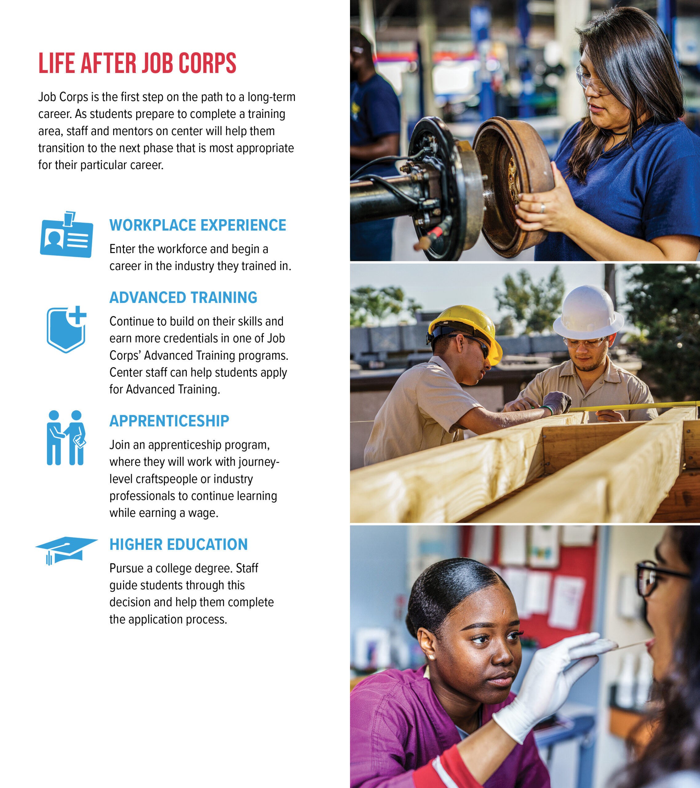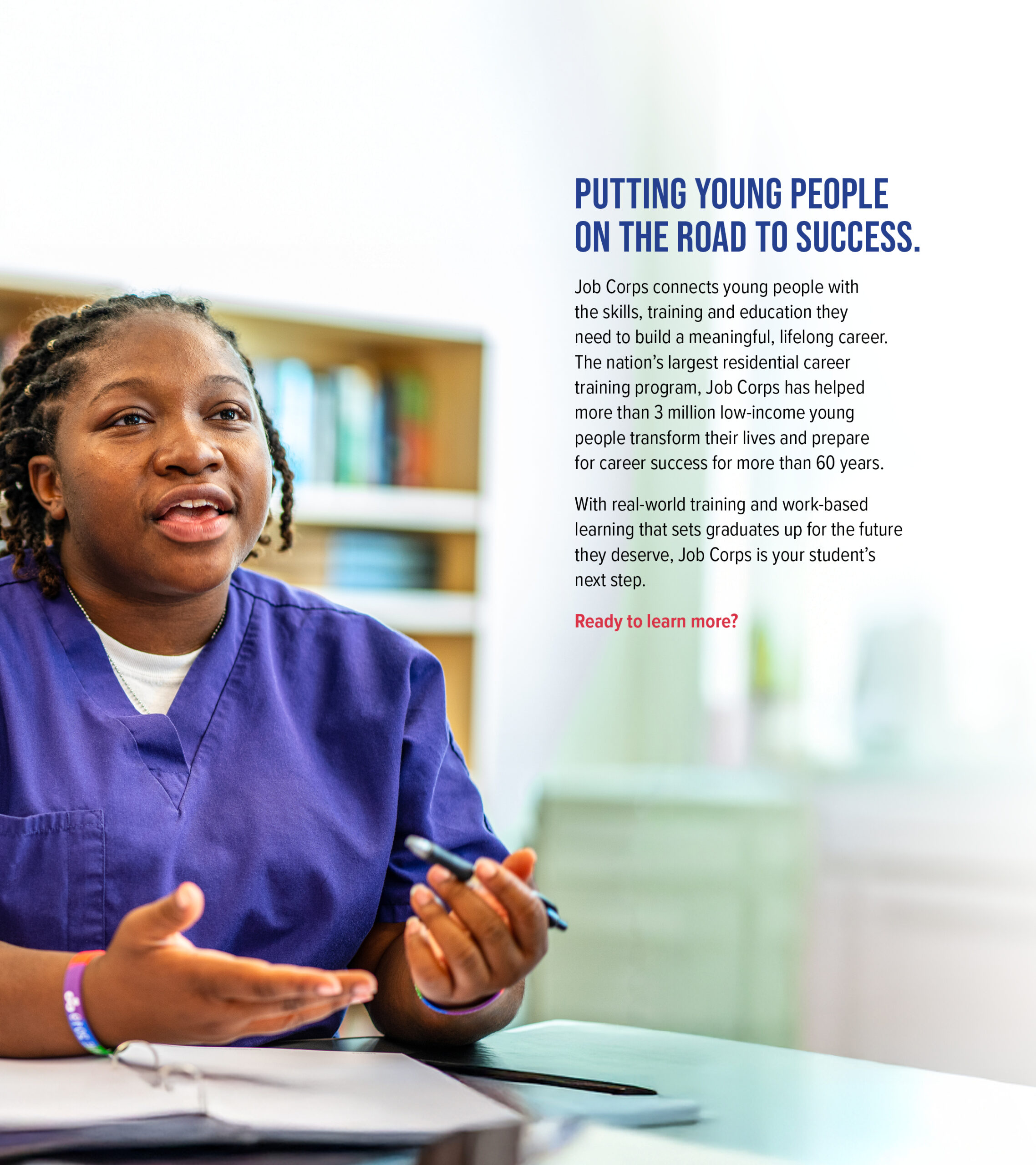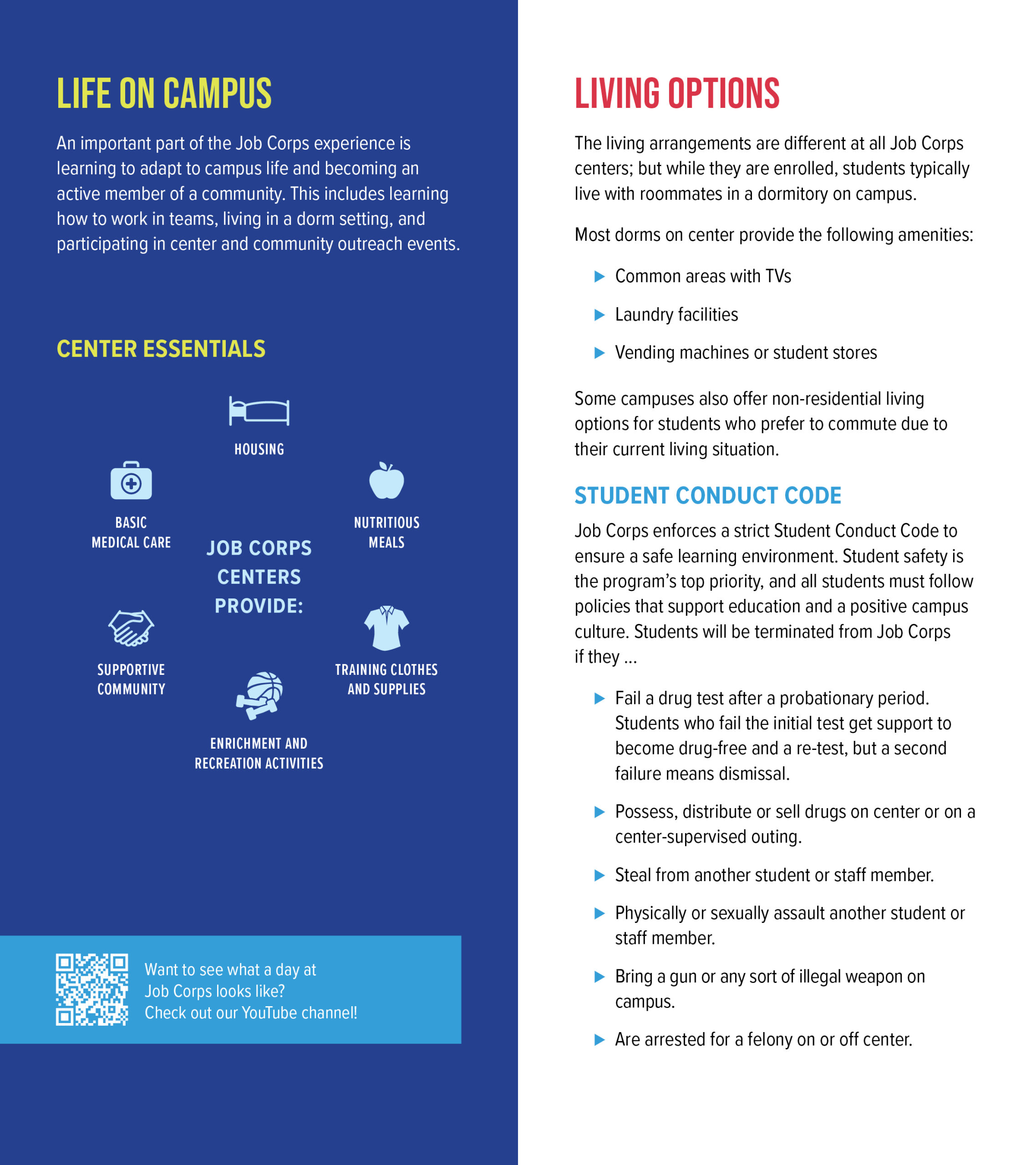 This bilingual guide answers questions that parents, guardians, or other key influencers might have about Job Corps’ training, education, and life on center. With one side in English, and the other in Spanish, this guide encourages parents and guardians to be involved in the important decision to enroll in the program and explains how Job Corps can help students gain the career skills and education needed for a promising future.