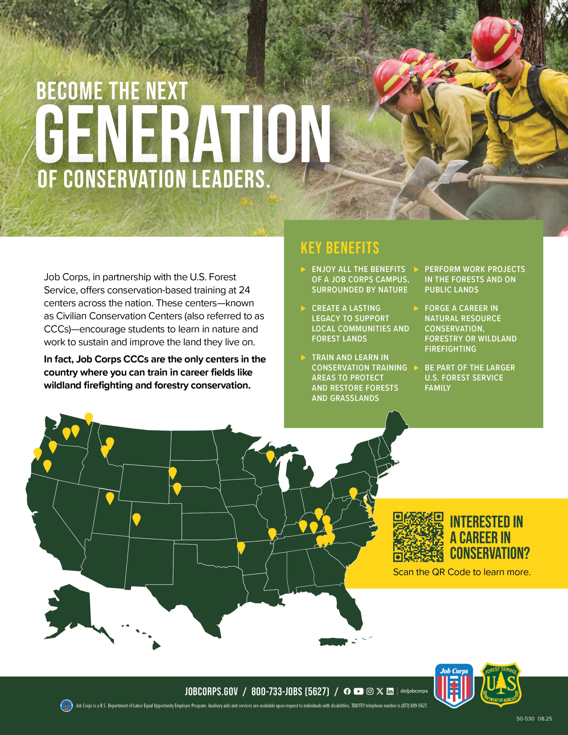 This downloadable one-pager can be shared with potential students, parents, employer partners, businesses and community leaders to promote Job Corps’ partnership with the U.S. Forest Service to provide conservation-based training options. It highlights the key differentiators of a Job Corps Civilian Conservation Center, providing information on training, locations and key benefits.